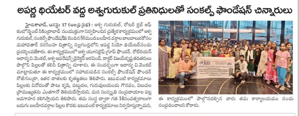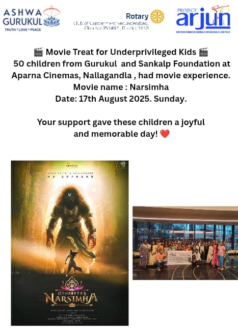 17th Aug 2025, kids from Ashwa Gurukul and Sankalp Foundation, experienced Narsimha movie at Aparna neo mall, nallagadla. sangareddy, Telangana.